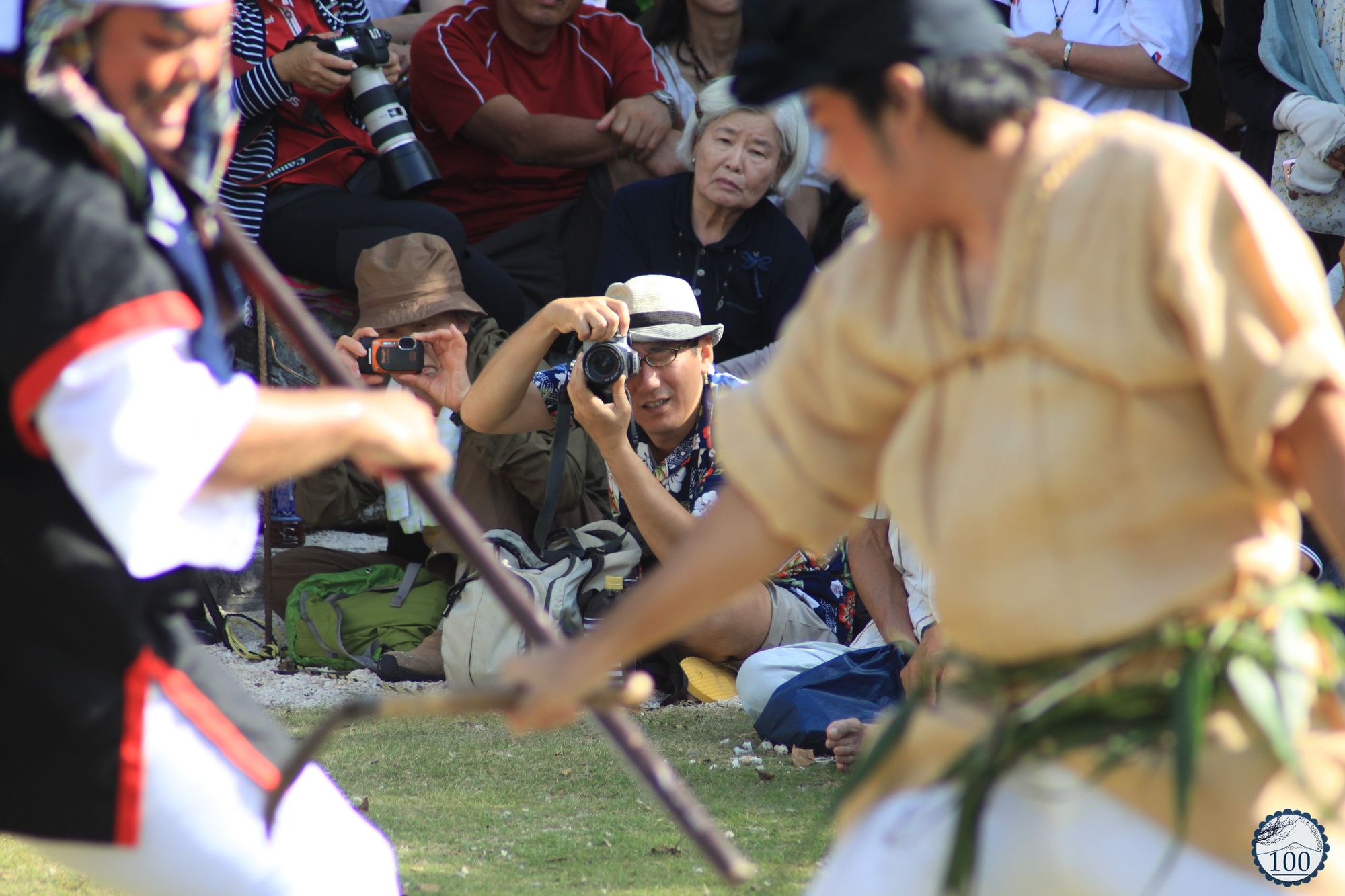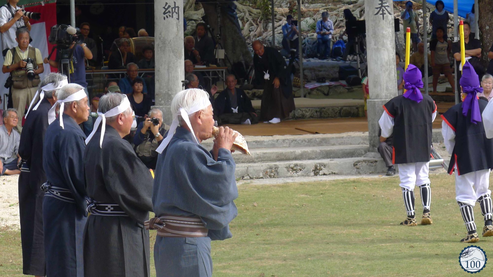 Après quelques ruelles parcourues, sur ce sable blanc qui ralentit le vélo, des silhouettes se détachent et les échos de percussions lointaines se font entendre. Toutes se dirigent vers l’effervescence d’un jour de fête. Sur l’esplanade du sanctuaire Yomochi utaki, plusieurs centaines de personnes sont déjà présentes. D’un côté des groupes de danseurs et danseuses aux costumes colorés attendent ici et là, bavardent, ou s’apprêtent à entrer sur la scène en plein air.