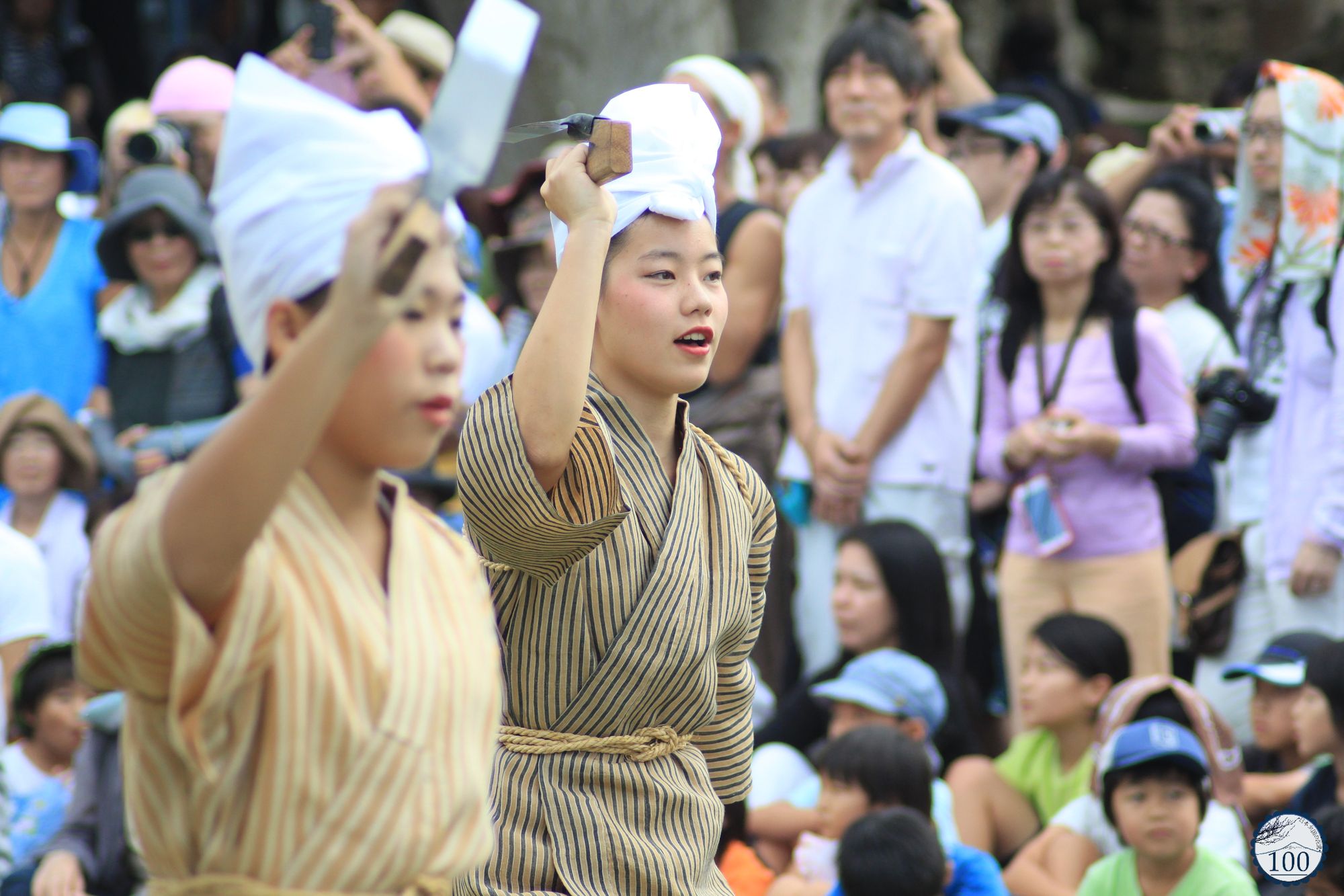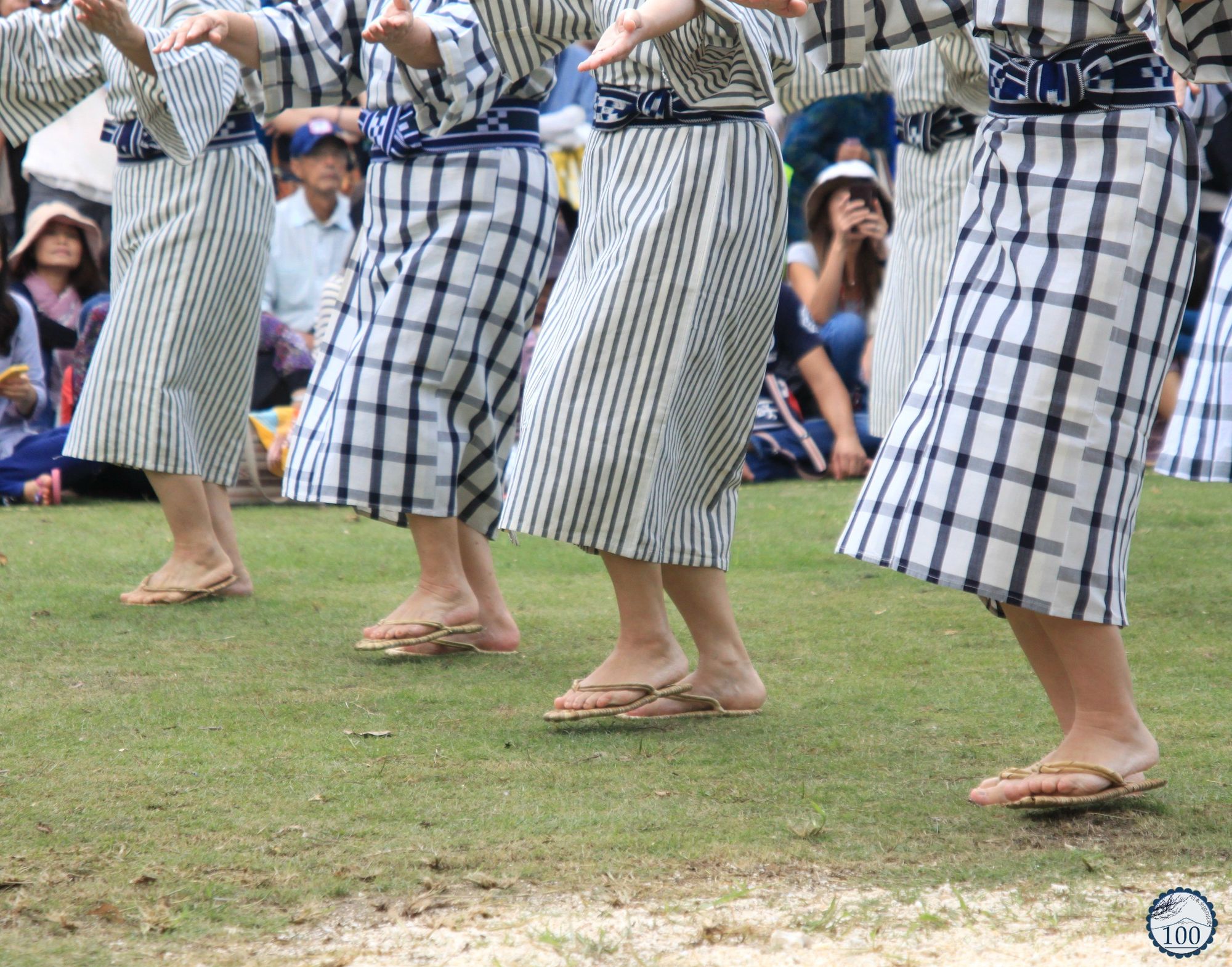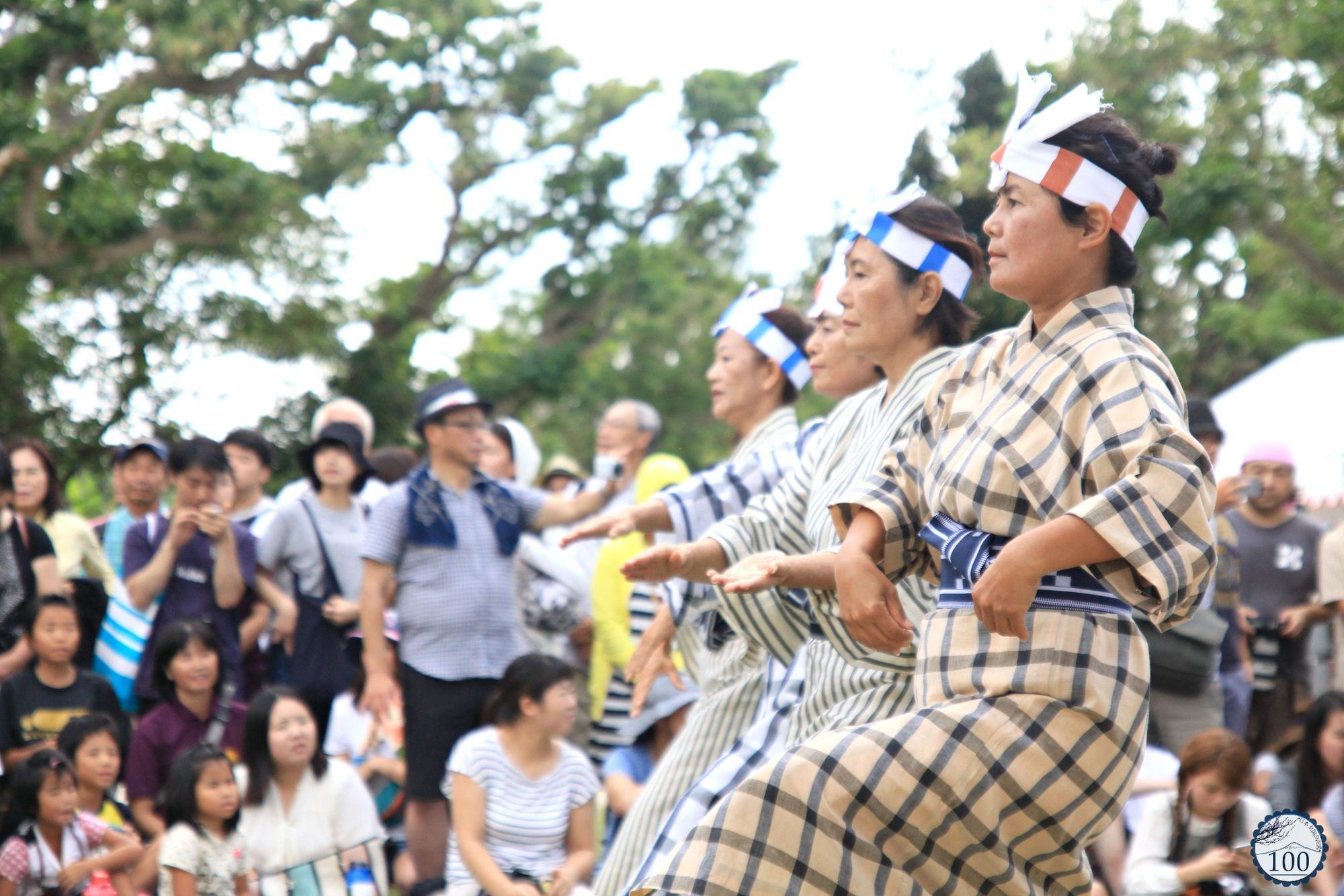 Les performances sont réalisées par tous les habitants – les véritables stars de la journée – de tous les âges, femmes, hommes, enfants et même les professeurs d’école. Un groupe de femmes d’âge mûr s’avance devant le public au rythme du chant. Vêtues de kimonos à carreaux, elles exécutent la danse des semis. Viendra ensuite un groupe de jeunes femmes pour célébrer le temps de la récolte dans des costumes de teinte beige et blancs.