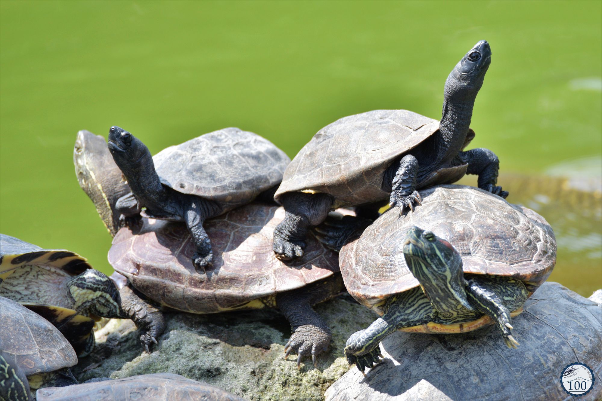 Situé sur une ancienne île en forme de tortue, rattachée à la côte suite aux remblaiements du début du XVIIe siècle, le sanctuaire est aussi le refuge d’un grand nombre de ces reptiles, qui nagent tranquillement sur l’eau verte des plans d’eau, croisant carpes et hérons, quand ils ne sont pas perchés à plusieurs sur leurs rochers.